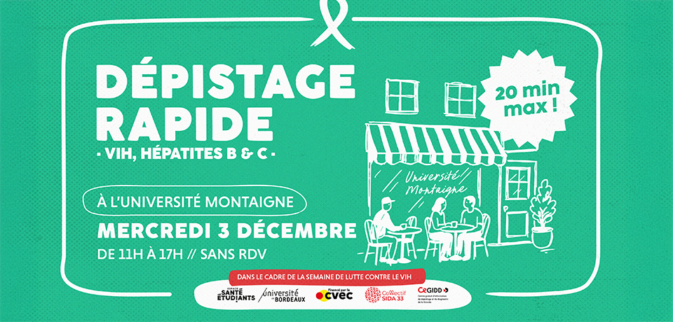La semaine du 1er décembre c’est la semaine de lutte contre le VIH. Dans ce cadre, l'Espace Santé Étudiants organise une journée de dépistage du VIH et des hépatites B & C, le mercredi 3 décembre de 11h à 17h, sur le parvis de l'Université Bordeaux Montaigne.