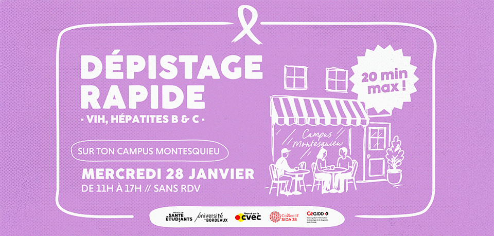 L'Espace Santé Étudiants organise une journée de dépistage du VIH et des hépatites B & C, le mercredi 28 janvier 2026 de 11h à 17h dans le hall B du campus Montesquieu à Pessac.