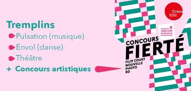 Musique, danse, théâtre, nouvelle, bande dessinée, film court et photographie : le Crous vous propose des tremplins et des concours artistiques ! Exprimez votre talent et tentez de remporter jusqu'à 2000€ et vivez des expériences uniques. Consultez les dates limites d'inscription pour chaque catégorie. +