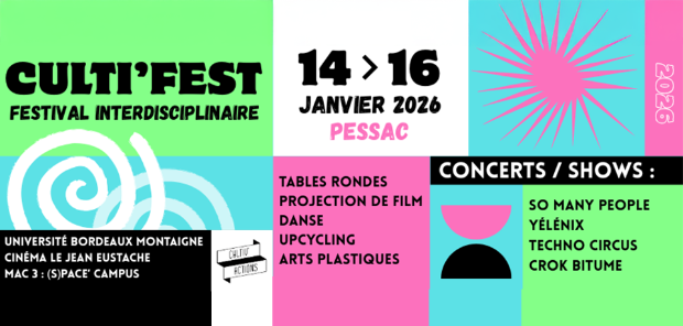 Pour cette nouvelle édition, le Culti’Fest affirme les valeurs qui animent les jeunes et les étudiant·es qui le portent : l’envie de faire collectif, de penser ensemble les grands enjeux de nos sociétés, comme l’écologie et l’inclusivité, et de questionner la place de ces préoccupations dans leurs futurs parcours professionnels. Un festival organisé par l’association Cultiv’actions, du 14 au 16 janvier 2026. +